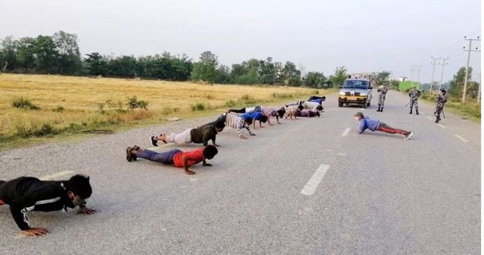तिलोत्तमा, रुपन्देही सरकारले आह्वान गरेको लकडाउनलाई अहिले प्रहरी तथा स्थानीय निकायले कडा रुपमा पालना गरिरहेका छन् । भैरहवामा लकडाउनलाई उल्लंघन गर्दै बिहीबार बिहान समूह बनाएर मर्निङ वाकमा निस्केका ५० जनामध्ये जेष्ठ नागरिकलाई सम्झाइबुझाइ र युवालाई भने सडकमै पुसअप व्यायाम गराइ कारबाही गरिएको छ ।