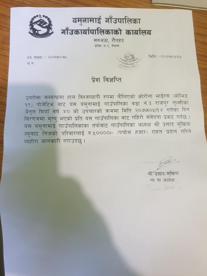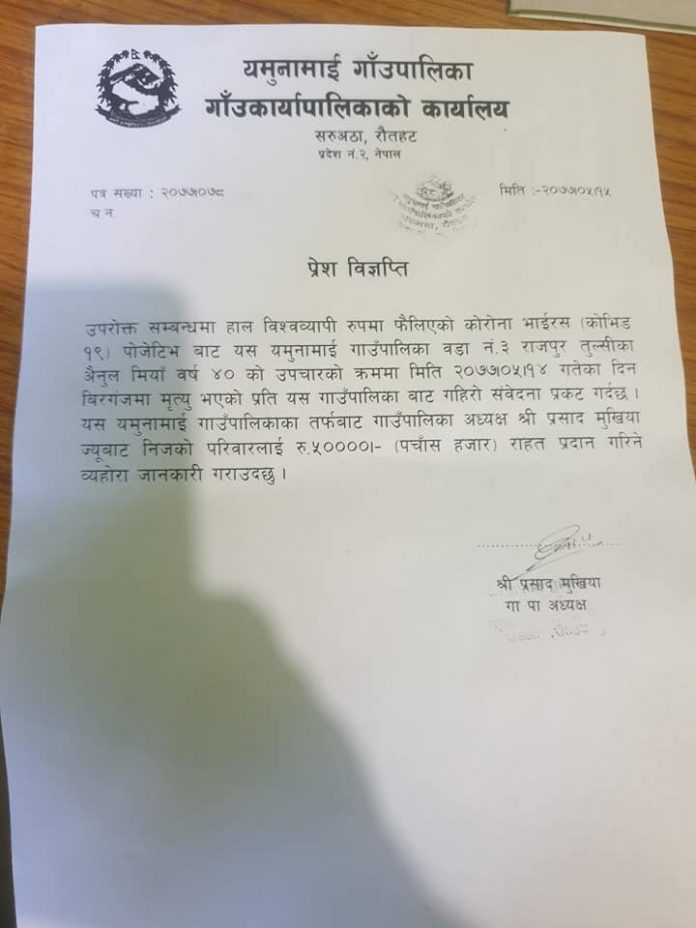 गाउपालिकाको वडा नं.३, राजपुर तुलसी निवासी शेख जैनुल मियाँको परिवारलाई नगद ५० हजार दिने घोषणा पालिका प्रमुख श्रीप्रसाद मुखियाले गरेका छन् । आईतबार मृत्यु भएका जैनुलका परिवारलाई प्रमुख मुखियाले शान्तवन्ता दिदैं भरपोषणका लागि ५० हजार नगद दिने घोषणा प्रेस विज्ञप्ती निकाल्दैं गरेका छन् । कोरोना बाट मृत्यु भएका परिवारजनलाई राहत उपलब्ध गराउने सम्भवत रौतहटमा यो पहिलो पालिका रहेको छ ।