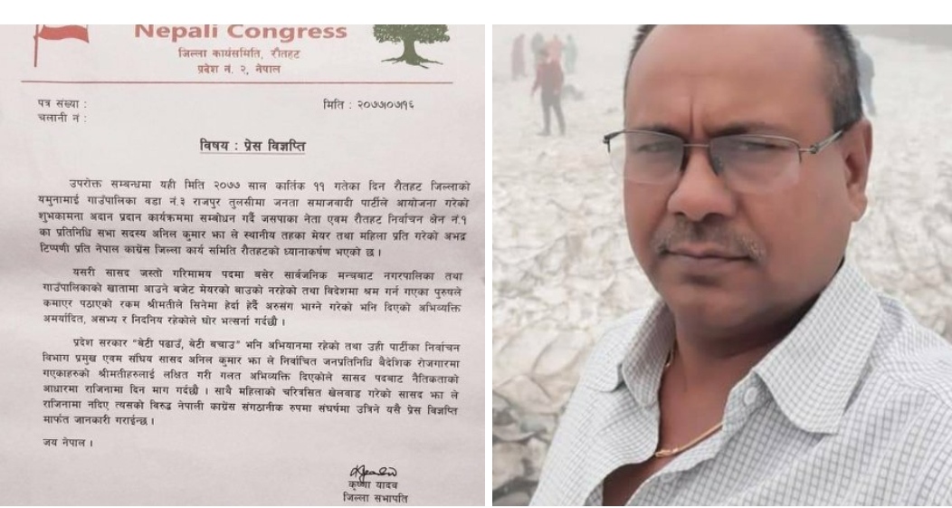 नेपाली काँग्रेस रौतहटका सभापति एवम राैतहट क्षेत्र १ का प्रत्यासी संविधानसभा सदस्य कृष्णा यादवले पूर्व उद्योग मन्त्री समेत रहेका सांसद झाले महिलाहरु प्रति गरेको अभद्र एवम अश्लिल टिप्पणीकाे घोर भत्र्सना गर्दै राजिनामाकाे माँग गरेको हाे ।
