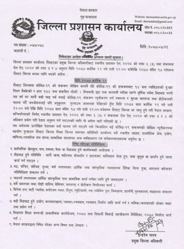 जिल्ला प्रशासन कार्यालय रौतहटले आज राति १२.०० देखि लागुहुने गरि मङ्सिर १७ गते मध्यरातसम्म निषेधाज्ञा जारी गरेको छ।