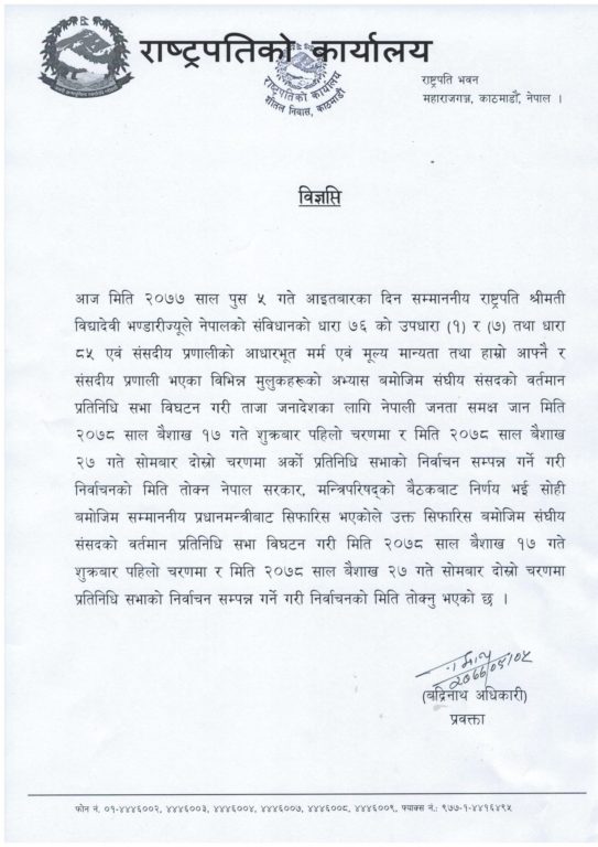 राष्ट्रपति कार्यालयले संविधानको धारा ७६ को उपधारा १ र ७ तथा धारा ८५ एवं संसदीय प्रणालीको आधारभूत मर्म एवं मान्यताको आधारमा ताजा जनादेशमा जान मन्त्रिपरिषद्बाट सिफारिस भएको जनाएको छ ।