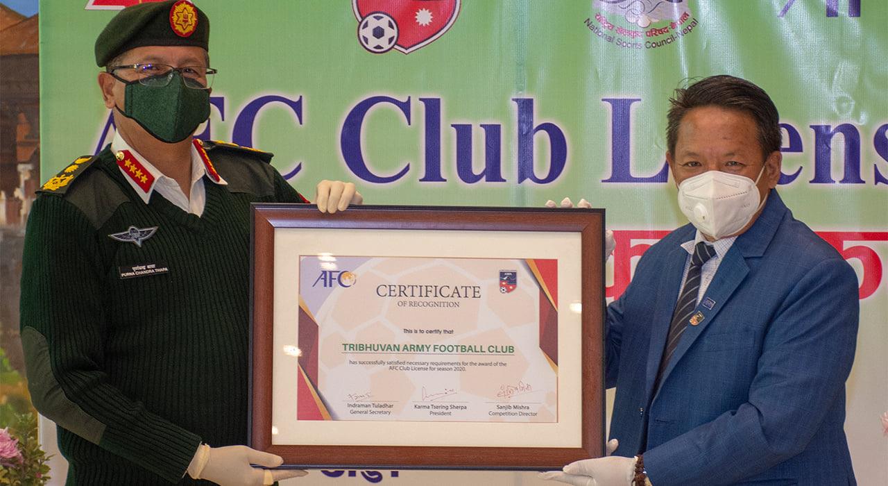 आर्मी मुख्यालयमा भएको कार्यक्रममा नेपाली फुटबलको सर्बोच्च निकाय एन्फाका अध्यक्ष शेर्पाले फिफा र एएफसीको सबै मापदण्ड पुरा गरी पाएको क्लव लाइसेन्सको प्रमाणपत्र आर्मीलाई हस्तान्तरण गर्नु भएको हो । सो प्रमाणपत्रलाई शेर्पाले आर्मीका प्रमुख पूर्णचन्द्र थापालाई हस्तान्तरण गर्नुभएको हो । विभिन्न मापदण्ड तोकिएकोमा पूरा गर्दै नेपालको शीर्ष डिभिजन लिग खेल्ने आर्मीलाई गत मंगलबार एएफसीले लाइसेन्स दिने निर्णय गरेको थियो ।