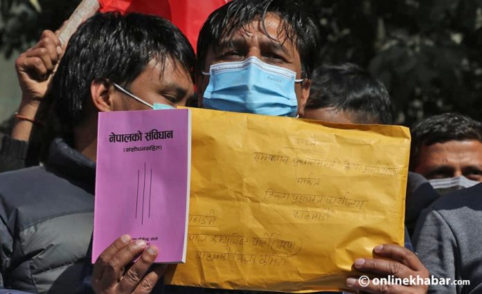 संसद विघटनको विरुद्धमा नेपाल कम्युनिष्ट पार्टी (नेकपा) प्रचण्ड–माधव समूहले देशैभरका जिल्ला प्रशासन कार्यालय मार्फत प्रधानमन्त्रीलाई संविधानको पुस्तक र विरोधपत्र पठाएको छ ।
