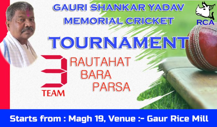 रौतहटमा गौरीशंकरयादव स्मृति क्रिकेट प्रतियोगिताको आयोजना भएको छ । जिल्लाको सदरमुकाम गौर नगरपालिकाको राइसमिल प्राङ्गणमा सोमबार देखि प्रतियोगिताको शुरुवात भएको हो ।