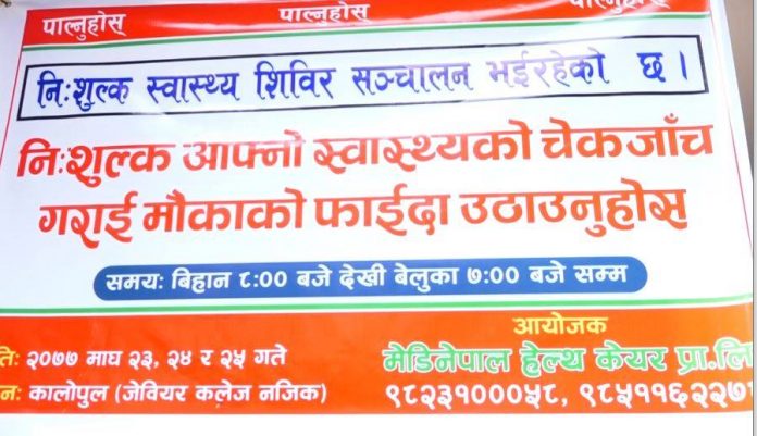 मेडि नेपाल हेल्थ केयर प्रा.लि.को आयोजनामा काठमाडौंको कालोपुलमा २३ गतेदेखि ३ दिने निशुल्क स्वास्थ्य शिविर सञ्चालन भएको हो । सबै मानिसको अस्पतालसम्म पहुँच नभएको र सानोतिनो समस्यामा अस्पताल नजाने चलन भएकाले नियमित चेकजाँच गर्ने र स्वास्थ्यको ख्याल राख्ने बानिको बिकास गराउनका लागि निशुल्क स्वास्थ्य शिविर सञ्चालन गरिएको मेडि नेपाल हेल्थ केयर प्रा.लि.का सञ्चालक समिति सदस्य सुजन अधिकारीले जानकारी दिनुभयो ।