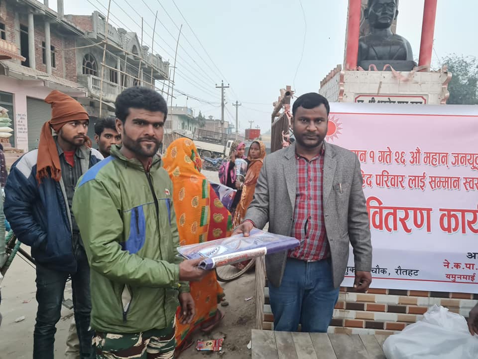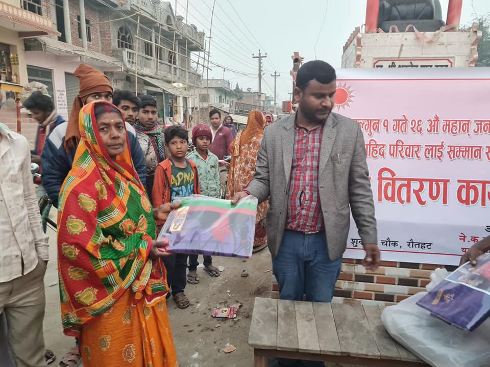 फागुन १ गते शनिवार रौतहटको यमुना माई गाउँपालिका वाड नम्बर १ जेठरहिया शुकदेव चौक मा २६औ जनयुद्ध दिवस अवसर पारी सहिद परिवारलाइ सम्मान स्वरुप साडि वितरण गरिएको हो ।
