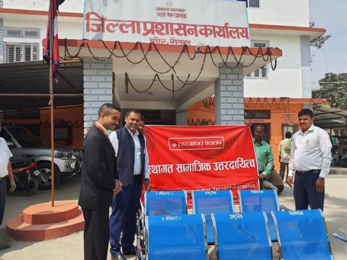 प्रभु बैंक गौर शाखा द्वारा जिल्ला प्रशासन कार्यालय गौरलाइ केहि फर्निचर सहयोग गरिएको हो । सेवाग्राहीलाई राम्रोसँग बस्नको लागि फलामको तीन वटा कुर्सी जोडिएको दुई थान संस्थागत सामाग्री दिइएको हो । आइतवार गौर शाखाका प्रबन्धक छवि रमन बरालले प्रमुख जिल्ला अधिकारी ईन्द्रदेव यादवलाई हस्तान्तरण गर्नु भएको थियो ।
