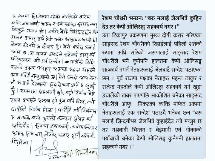 काठमाडौं । जेलमा रहे पनि म सांसद हुँ, मेरो मर्यादा मलाई थाहा छ : रेशम चौधरी जनता समाजवादी पार्टीका निलम्बित सांसद रेशम चौधरीले जेलबाटै विज्ञप्ति निकालेका छन्। उनले केही मिडिया र सामाजिक सञ्जालमा आफ्नो नाम जोडेर भ्रामक तथा कपोकल्पित अभिव्यक्ति सार्वजनिक गरेको भन्दै ध्यानार्षण जनाएका छन्।उनले आफू जेलमा रहेपनि सांसद भएको र आफूलाई सांसदको मर्यादा थाहा भएको उल्लेख गरेका छन्। ‘ जेलमा रहे पनि म सांसद हुँ। मेरो मर्यादा मलाई थाहा छ, म गलत शब्दले कसैलाई प्रहार गर्न परिकल्पना पनि गर्न सक्दैनँ,’ उनले भनेका छन्। केही दिनअघि उनको नामबाट केपी ओलीसँग कुनै पनि हालतमा सहकार्य गर्न नहुने अभिव्यक्ति सार्वजनिक भएको थियो। उक्त अभिव्यक्ति जसपाकै विद्यार्थी नेताहरुले सार्वजनिक गरेको बताइएको छ। म जेलमा छु। जेलमा रहेको व्यक्तिको बारेमा बाहिर जथाभाबी भ्रामक र कपोल्पित कुराहरु ल्याउनु विल्कुलै गलत हो।बाहिर केही मिडियाहरुले गरेको गलत प्रचारप्रति मेरो ध्यान आकृष्ट भएको छ। जेलमा रहे पनि म सांसद हुँ। मेरो मर्यादा मलाई थाहा छ, म गलत शब्दले कसैलाई प्रहार गर्न परिकल्पना पनि गर्न सक्दैनँ। पार्टीको विधि, पद्धति प्रक्रियाअनुसार अध्यक्ष महन्थ ठाकुरले काम गरी नै रहनुभएको छ। मेरो दलको अन्य नेताले मप्रति देखाएको सदासेयताप्रति म खुसी छु। सरकारमा सहभागी हुने, नहुने निर्णय मेरो एकल प्रयासले सम्भव हुने कुरा पनि होइन, त्यो पार्टीको निर्णय होला। पार्टीले गर्ने निर्णयमा म बाधक बन्ने कुराको कल्पनासमेत गर्न सकिँदैन। क्रिपया जथाभाबी, कपोल्पित र भ्रामक समाचार लेखेर मलाई दुःखि नबनाइदिनुहोला।