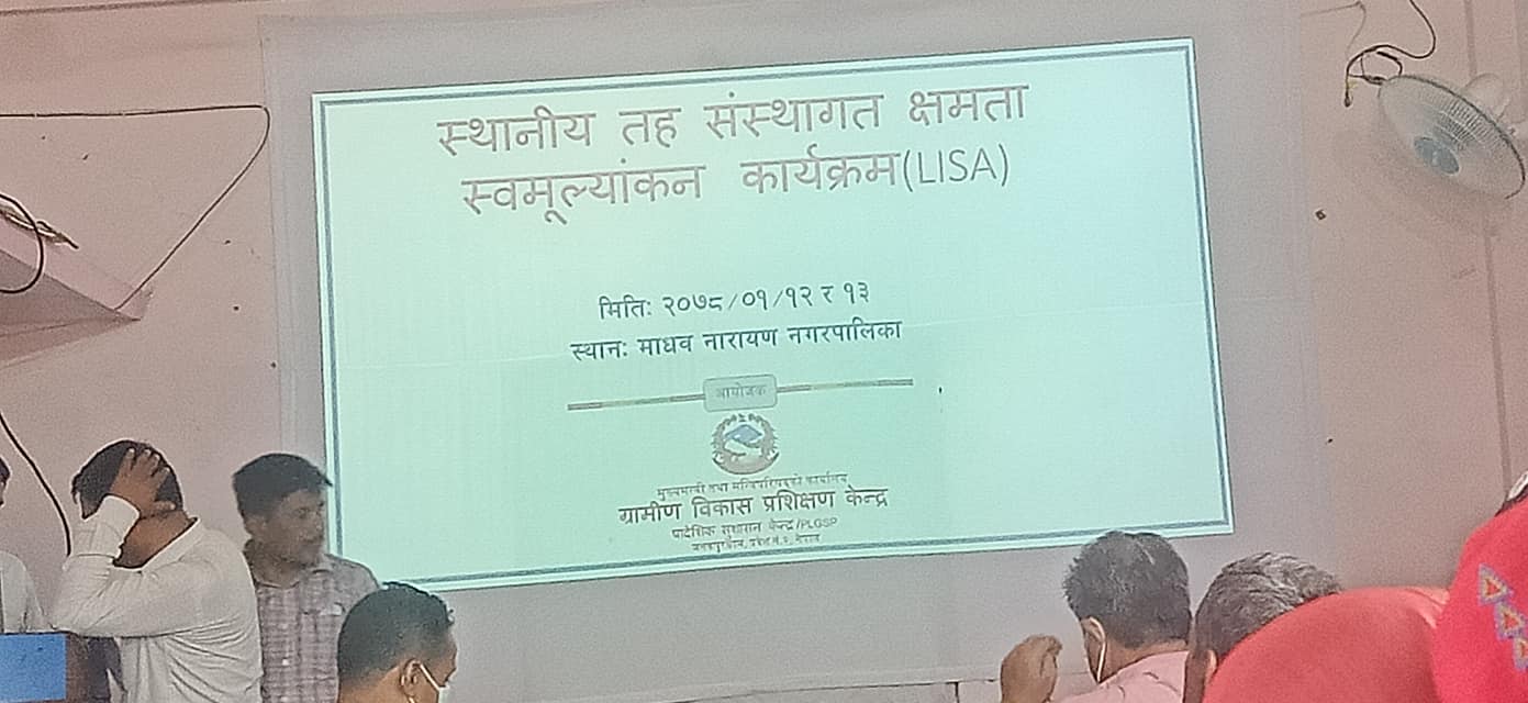 प्रदेश २ को मुख्यमन्त्री तथा मन्त्रिपरिषद कार्यालय अन्तर्गत रहेको ग्रामीण विकास प्रशिक्षण केन्द्र जनकपुरको आयोजनामा आजदेखी शुरु भएको कार्यक्रम भोलीसम्म चल्ने छ ।स्थानीय तहको प्रभावकारी कार्यसञ्चालनमा सहयोग पुग्ने अभिप्रायले सञ्चालित कार्यक्रममा स्थानीय पालिकाको वर्तमान अवस्था, यहाँबाट प्रवाह हुने सेवा तथा सुविधा लगाएत विभिन्न विषयहरुमा स्थानीय सरकारको कार्य सम्पादनको स्थिती थाहा पाउन संस्थागत स्वमूल्यांकन अर्थात स्वलेखाजोखा गरिएको हो ।