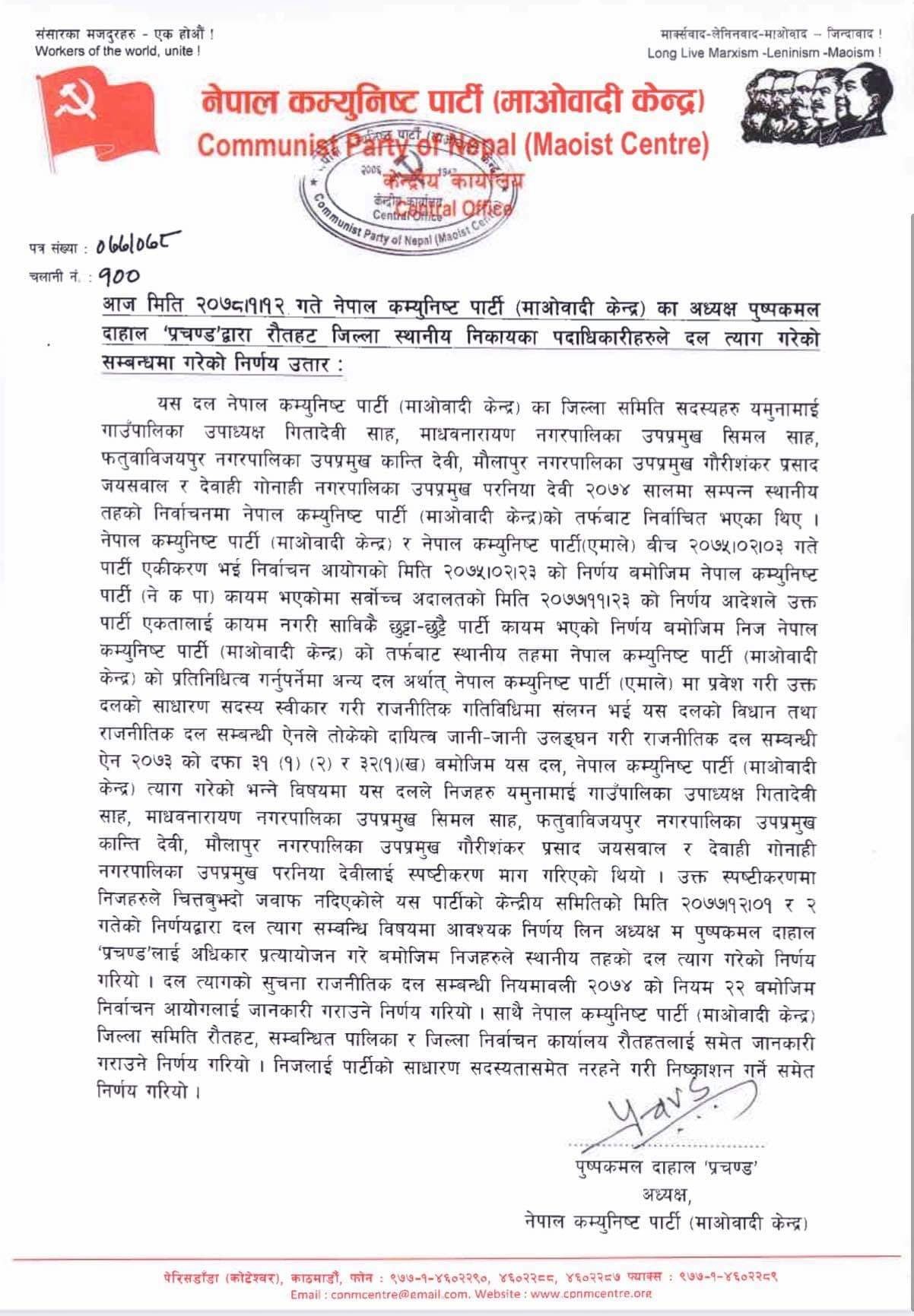 रौतहटमा नेकपा माओवादी केन्द्रका ५ उपप्रमुखलाई पार्टीबाट साधरण सदस्य समेत नरहने गरि निष्कासन गरेको छ । नेकपा माओवादी केन्द्र रौतहट जिल्ला समिति सदस्यसमेत रहेका माधवनारायण नगरपालिकाका उपप्रमुख सिमल साह , फतुवाविजयपुर नगरपालिकाको उपप्रमुख कान्ति देवी , मौलापुर नगरपालिकाका उपप्रमुख गौरीशैकर प्रसाद जयसवाल , देवाही गोनाही नगरपालिकाका उपप्रमुख परनिया देवी र यमुनामाइ गाउपालिकाका उपाध्यक्ष गीतादेवी साह २०७४ सालमा सम्पन्न स्थानिय तहको निर्वाचनमा नेकपा माओवादी केन्द्रको तर्फबाट निर्वाचित भएका थिए । नेकपा माओवादी केन्द्र र नेकपा एमालेबीच २०७५ साल जेठ ३ गते पार्टी एकिकरण भइ निर्वाचन आयोगले २०७५ जेठ २३ गते नेपाल कम्युनिष्ट पार्टी नेकपा कायम गराएको थियो । तर सर्वोच्च अदालतले २०७७ फागुन २३ गतेको आदेशले उक्त पार्टी एकता कायम नगरि सावित कै छुट्टा छुट्टै पार्टी कायम भएको फैसला गरेको थियो । सो फैसला भइपश्चात रौतहटका ५ जना उपप्रमुखहरु नेकपा माओवादी केन्द्र दलको प्रतिनिधित्व गर्नु पर्नेमा ५ जनाले नै अन्य दल अर्थात नेकपा एमालेमा प्रबेश गरि उक्त दलको साधरण सदस्य स्वीकार गरी राजनितिक गतिविधिहरुमा संलग्न भइ नेकपा माओवादी केन्द्रको विधान तथा राजनितिक दल सम्बन्धि ऐनले तोकेको दायित्व जानी जानी उल्लङघन गरेकाले स्पष्टिकरण सोधिएको थियो । स्पष्टिकरण चित्त बुझ्दोे नआएकोले नेकपा माओवादी केन्द्रका अध्यक्ष पुष्पकमल दाहालले साधरण सदस्य समेत नरहने गरि पार्टी निष्कासन गरेको हो । कारवाहीमा परेका रौतहटका ५ जना उपप्रमुखहरुले दल त्याग गरेकाले नेकपा माओवादी केन्द्रको साधरण सदस्य समेत नरहने गरि निष्कासन गरिएको बताउनु भयो ।
