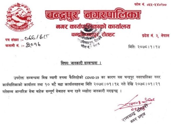 रौतहट जिल्लाको चन्द्रपुर नगरपालिकाले भोली बुधवार देखि एकसाता सम्मको लागि बाह्य कामकाज बन्द गर्ने भएको छ । कोभिड १९ को दोश्रो लहर तिव्र रुपमा फैलिदै जाँदा कर्मचारी र नगरवासीलाई सुरक्षित राख्नका निमित्त बन्द गर्ने निर्णय गरिएको हो। बढ्दो कोरोना संक्रमणको जोखिमलाई मध्यनजर गर्दै नगरपालिकाको आन्तरिक सेवा बाहेक सम्पुर्ण सेवाहरु बन्द गर्ने भएको मेयर रामचन्द्र चौधरीले बताएका छन् ।पुर्व पश्चिम राजमार्ग संग जोडिएका रौतहटको चन्द्रपुर नगरपालिकाको आन्तरिक काम बाहेक बाह्य काम बुधबार देखि एक साताको लागि बन्द रहने निर्णय गरेको हो । चन्द्रपुर नगरपालिकामा रहेका १० वटै वडा कार्यालयहरुबाट बाह्य सेवाहरु बन्द रहने चौधरीले जनाएको छ। वैशाख १५ देखि २१ गते सम्म बन्द रहने मेयर चौधरीद्धारा हस्ताक्षरित विज्ञप्तीमा उल्लेख गरिएको छ ।