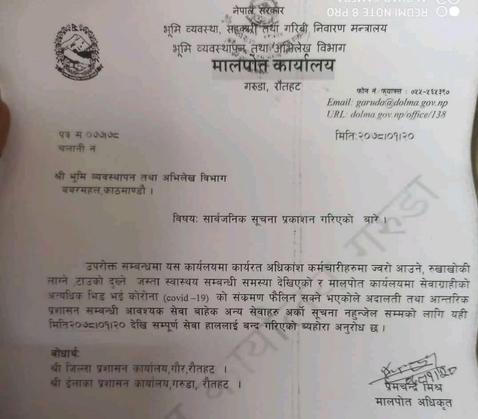 रौतहटको गरुडा मालपोत कार्यालय सोमबारबाट बन्द भएको छ । रौतहटमा कोरोना संक्रमण दर बढ्दै गएसँगै गरुडा मालपोत कार्यालयका अधिकांस कर्मचारीहरुमा ज्वरो आउने , रुघाखोकी लाग्ने , टाउको दुख्ने जस्ता स्वास्थ्य सम्बन्धि समस्या देखिएको मालपोत कार्यालय गरुडाका मालपोत अधिकृत प्रेमचन्द्र मिश्रले बताउनु भयो । कार्यालयमा सेवाग्राहीहरुको अत्याधिक भिडभाड हुने भएकाले कोरोना संक्रमण फैलन सक्ने जनाउदै अदालती तथा आन्तरिक प्रशासन सम्बन्धि आवश्यक सेवाहरु बाहेक अन्य सेवाहरु अर्को सुचना नआउन्जेल सोमबारबाटै सबै सेवाहरु बन्द गरिएको मिश्रले बताउनु भयो । रौतहटमा केही दिन यता कोरोना संक्रमण दर दिनानुदिन बढ्दै गइरहेको छ तर मानिसहरुको भिडभाडमा भने कमी आउन सकेको छैन ।