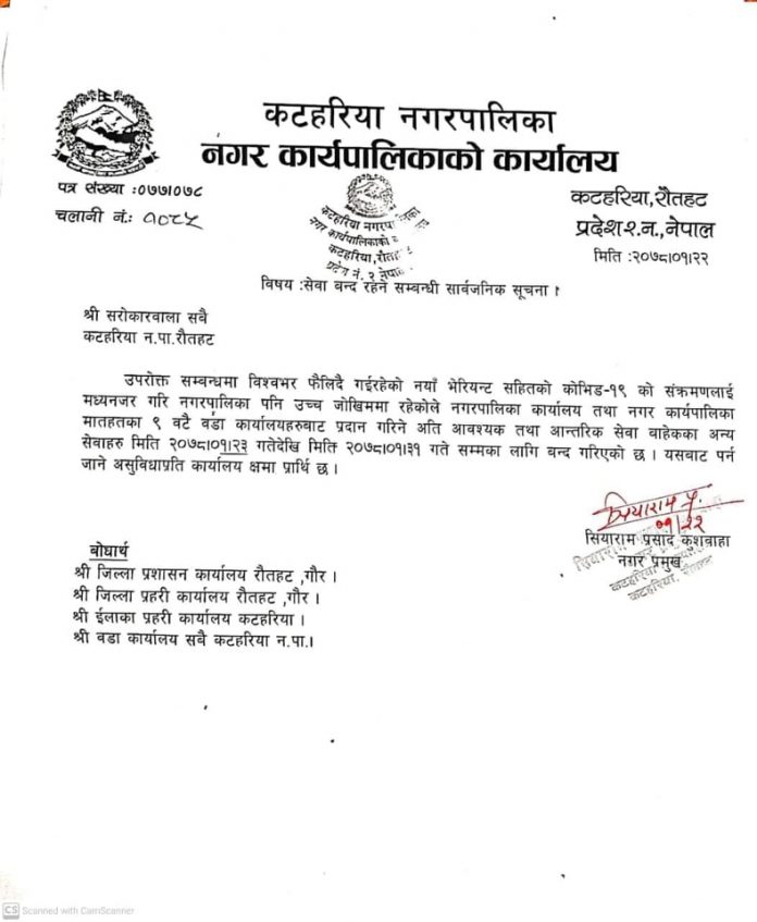 रौतहटको जिल्लाको कटहरिया नगरपालिकाले आफ्नो सेवा बन्द गरेको छ । कटहरियामा कोरोना संक्रमणको उच्च जोखिममा परेको जनाउदै विहिबार लागु हुने गरि कटहरिया नगरपालिकामा रहेका ९ वटै वडा कार्यालयहरुका आफ्नो आन्तरिक सेवा मात्र प्रदान गर्ने गरि अन्य सबै सेवा बन्द हुने नगर प्रमुख सियाराम कुशवाहाले बताउनु भयो । मुलुकभर कोरोना संक्रमण दर उच्च रहेकोमा रौतहटमा पनि दिनानुदिन कोरोना संकटको सम्भावना बढ्दै गएको छ । कोरोना जोखिमबाट सेवाग्राहीहरुलाई बच्न र आफु पनि बच्न नगरपालिकाले बिहिबारबाट बैशाख ३१ गतेसम्म आन्तरिक सेवाका लागी मात्र नगरपालिका सञ्चालन हुने नगर प्रमुख कुशवाहाले बताउनु भयो ।