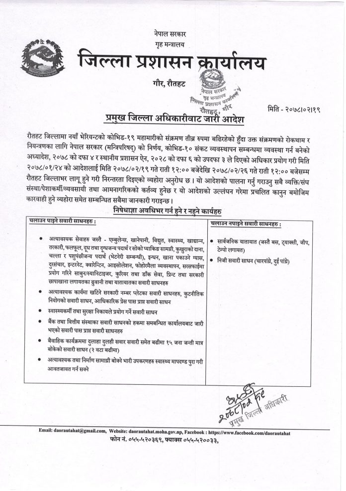 रौतहटमा निषेधाज्ञा फेरि लम्ब्याईएको छ । अगामी जेठ २६ गते रातिसम्म निषेधाज्ञा कायम गरिएको हो । जिल्ला प्रशासन कार्यालय रौतहटले बुधवार एक सूचना जारी गरी अगामी जेठ २६ गते राति १२ बजेसम्मको लागि निषेधाज्ञा जारी गरेको जानकारी दिएको छ ।