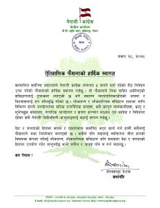 लोकतन्त्र र लोकतान्त्रिक संविधान रक्षाका लागि विभिन्न ढंगले आन्दोलनमा सरिक राजनैतिक दल, सबै कानून व्यवसायी, भातृ तथा शुभेच्छुक संस्था, नागरिक आन्दोलन र सजग सञ्चार माध्यम एवं स्वदेश तथा विदेशमा रहेका सबै नेपालीप्रति कांग्रेसले बधाई समेत दिएको छ ।