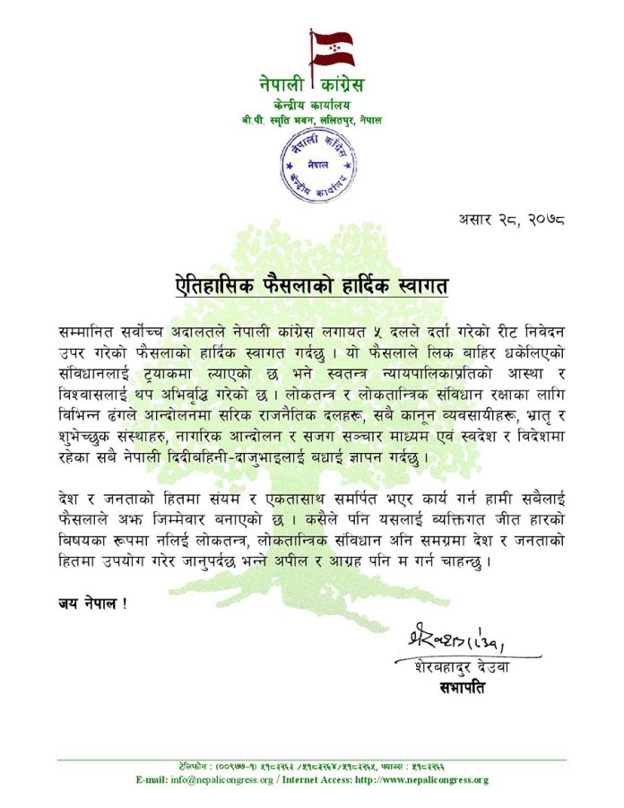 नेपाली कांग्रेसका सभापति शेरबहादुर देउवाले सोमबार प्रेस विज्ञप्ति जारी गर्दै सर्वोच्चको फैसलालाई कसैले पनि व्यक्तिगत जित हारको विषयका रुपमा नलिई लोकतन्त्र, लोकतान्त्रिक संविधान अनि समग्रमा देश र जनताको हितमा उपयोग गरेर जानुपर्नेमा जोड दिएका छन् ।