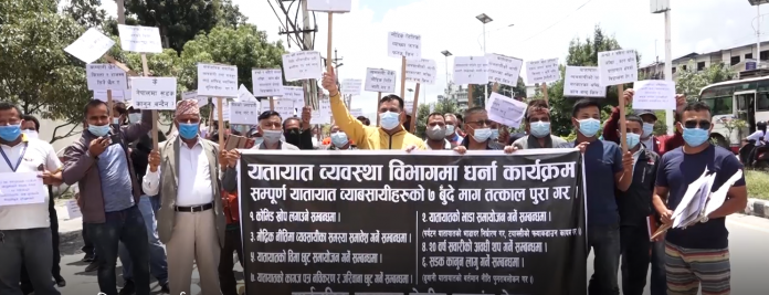 यातायात व्यवसायीले लकडाउनको कारण व्यवसाय नै धरापमा परेको भन्दै सरकारले विशेष राहत दिनुपर्ने बताउँदै आएका छन् । धर्नाका क्रममा नारावाजी समेत गरेका थिए भने आम्दानी छैन बैंक किस्ता र राजस्व तिर्ने छैन, बैंकको ज्यादती बन्द गर, निषेधाज्ञा अवधिभरको विमा पूर्ण रुपमा छुट गर लगायतका प्लेकार्ड प्रदर्शन समेत गरेका थिए ।