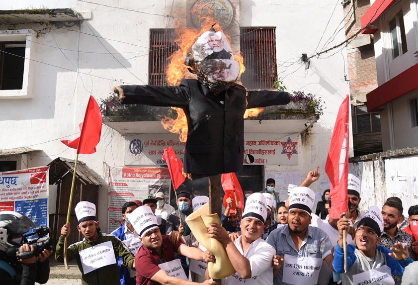 काठमाडौँ — दार्चुला घटना र नेपाली आकाशमा अनधिकृत भारतीय उडान गरेको विषयमा सरकार चुप लागि रहेका बेला सत्ता गठनबन्धनमा आबद्ध दल नेकपा (एकीकृत समाजवादी) को भ्रातृ सगंठन नै विरोधमा उत्रिएको छ । नेकपा (एस)को विद्यार्थी संगठन अनेरास्ववियूले शुक्रबार भारतीय प्रधानमन्त्री नरेन्द्र मोदीको पुत्ला दहन गरेको छ ।अनेरास्ववियुका अध्यक्ष सुरेश पराजुलीको नेतृत्वमा रत्नराज्यलक्ष्मी क्याम्पस परिसरमा मोदीको पुत्ला दहन गरेको हो । भारतीय हेलिकोप्टरहरू अनुमतिबिनै पटक-पटक दार्चुलामा प्रवेश गरेको समाचार आएपछि विद्यार्थीहरूले प्रदर्शन गरेका हुन् ।