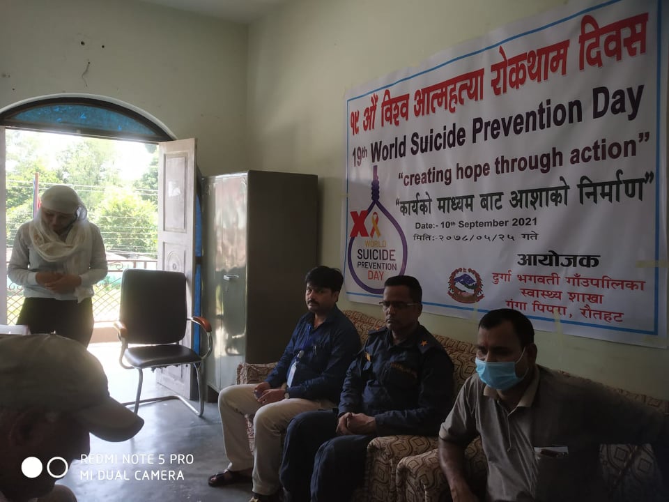 आज बिश्व १९ औं आत्महत्या रोकथाम दिवश रौतहटको दुर्गा भगवती गाउँपालिकाले एक कार्यक्रमको आयोजना गरि मनाएको छ ।आत्महत्याको सोच भएको व्यक्तिहरुलाई सहयोग गरौँ तथा १९ औं आत्महत्या रोकथाम दिवश सफल पारौं नाराको साथ् १९ औं आत्महत्या रोकथाम दिवश दुर्गाभगवती गाउँपालिकाको स्वास्थ्य शाखाको आयोजनामा सम्पन्न भएको छ ।