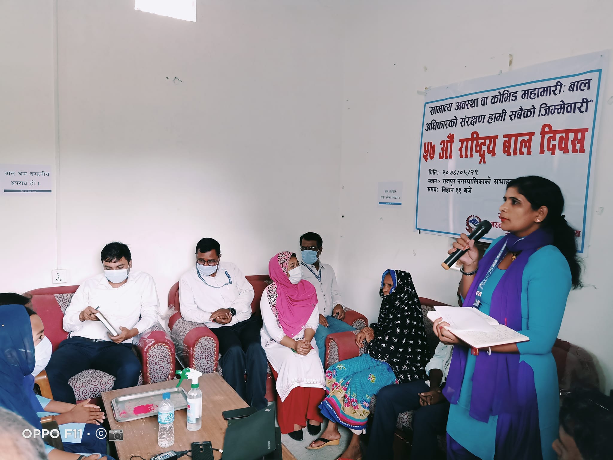 बालदिवशको अवशरमा राजपुर् नगरपालिकाले आयोजना गरेको अन्तरक्रिया तथा बालबालिकाको सम्मान कार्यक्रममा राजपुर् नगरपालिकाको अधिकृत छौठो बैजु ठाकुर शिक्षा शाखा प्रमुख दिपक खत्री, महिला तथा बालबालिका शाखा प्रमुख जुनैदा खातुन, राजपुर् नगरपालिकाको उपप्रमुख जफिरा खातुनको उपस्थिति रहेको थियो ।