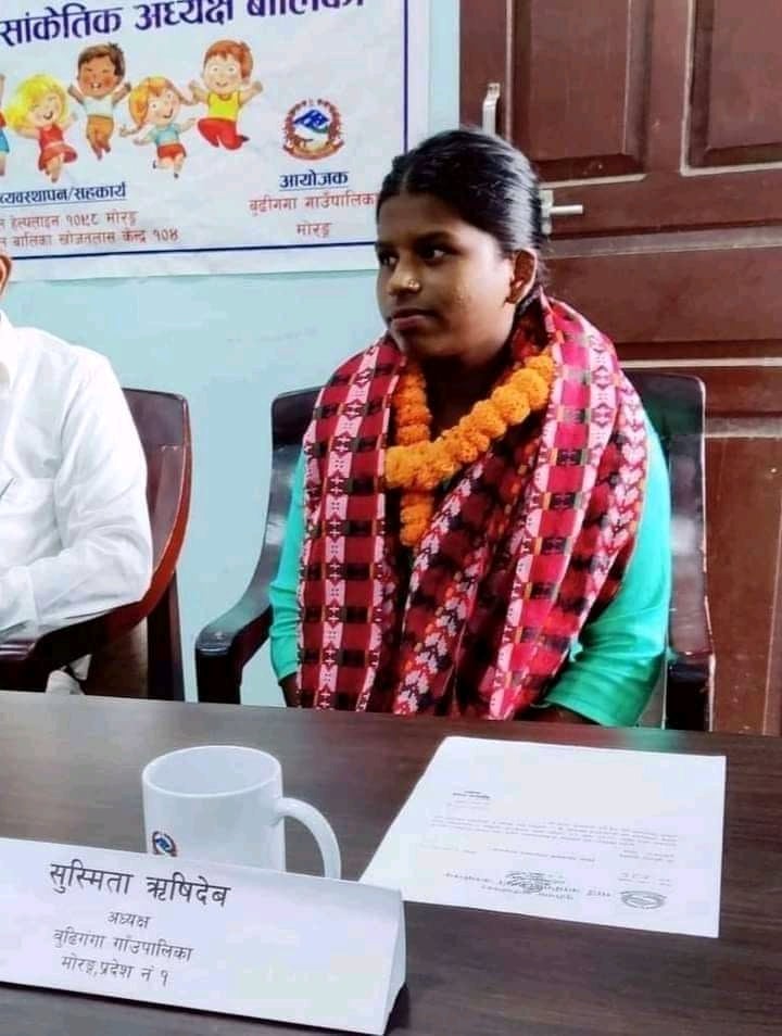 २९ भदौ, विराटनगर । मोरङकी १६ वर्षीया बालिका सुस्मिता ऋषिदेव एक दिनका लागि बुढीगंगा गाउँपालिकाको अध्यक्ष बनेकी छन् । ५७ औं राष्ट्रिय बाल दिवसको अवसरमा उनलाई एक दिनका लागि अध्यक्षको जिम्मेवारी दिइएको हो ।