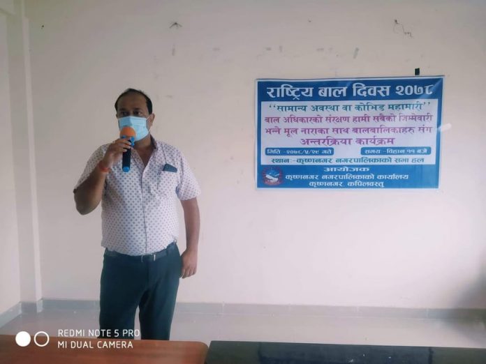 कपिलवस्तु सामान्य अवस्था वा कोभिड महामारी: बालअधिकारको संरक्षण हामी सबैको जिम्मेवारी “ भन्ने राष्ट्रिय नाराका साथ राष्ट्रिय बाल अधिकार दिवसको अवसरमा कृष्णनगर नगरपालिकाको सभा हलमा बाल बालिकाहरू संग अन्तर क्रिया कार्यक्रम सम्पन्न भएको छ l कृष्णनगर नगरपालिकाको आयोजना तथा कृष्णनगर नगरपालिका का प्रमुख प्रशासकीय अधिकृत विजय कुमार कार्की को अध्यक्षता, प्रमुख अतिथिमा कृष्णनगर नगरपालिका नगर प्रमुख रजत प्रताप शाह, अतिथि हरूमा लुम्बिनी प्रदेश मदरसा बोर्ड उपाध्यक्ष मौलाना मशहूद खां नेपाली, शान्ति पुनर्स्थापना गृह कपिलवस्तु संयोजक निशु पन्थी, आफन्त नेपाल कपिलवस्तु संयोजक केशर विश्वकर्मा, वडा अध्यक्ष संजय कुमार गुप्ता, वडा अध्यक्ष छेदी प्रसाद यादव,वडा अध्यक्ष मोहम्मद मोवीन खां, जाहिर आजाद झण्डानगरी रहनुभयो l कार्यक्रममा बोल्दै प्रमुख अतिथि शाहले बाल अधिकार संरक्षण हामी सबैको दायित्व रहेको बताउदै नगरको सरसफाइमा विद्यार्थी हरुको भुमिका अहम हुनुपर्ने बताउनुभयो l कार्यक्रममा बोल्दै बोर्ड उपाध्यक्ष मौलाना मशहूद खां नेपाली ले बाल बालिका हरूको सर्वांगीण विकासमा आमाको भूमिका महत्वपूर्ण रहेको बताउदै अनुसासन नै बाल बालिका तथा विद्यार्थी हरूको गहना रहेको भन्ने भाव व्यक्त गर्नु भयो l कार्यक्रममा बोल्दै प्रमुख प्रशासकीय अधिकृत विजय कुमार कार्की ले उपस्थित सबैमा धन्यवाद दिदै बाल बालिका हरुको विकासका लागि नगरपालिका ले बजेट छुट्याएको बताउदै बाल बालिका हरूको उज्जवल भविष्यको कामना समेत गर्नुभयो l कार्यक्रम स्वागत तथा शुभकामना कृष्णनगर नगरपालिका महिला तथा बाल बालिका शाखा प्रमुख थुमा उपाध्याय ले गर्नुभयो साथै कार्यक्रममा युनिसेफका प्रकाश कैनी ले प्रशिक्षकको भुमिका निर्वाह गर्नुभयोl उक्त कार्यक्रममा विद्यार्थी, शिक्षक, समाजसेवी, शिक्षा प्रेमी, वुद्धजीवी, पत्रकार, कर्मचारी लगायत अन्यको उपस्थित थियो l कार्यक्रम संचालन ईश्वरी प्रसाद पौडेल ले गर्नुभयोl