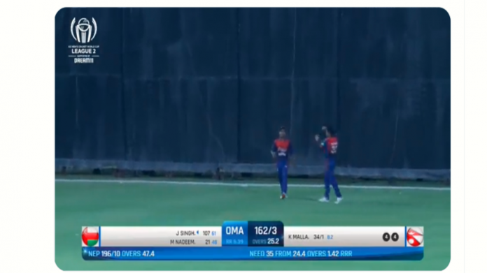 काठमाण्डौ – आईसीसी क्रिकेट विश्व कप लिग–२ अन्तर्गत त्रिदेशीय एकदिवसीय शृङ्खलाको नेपाल र ओमानबीच भएको खेलमा रोहितकुमार पौडेलले लिएको क्याचको चर्चा चुलिएको छ । बाउन्ड्री लाइनमा उफ्रिँदै रोहितले लिएको क्याचको प्रशंसा आईसीसीले पनि गरेको थियो ।