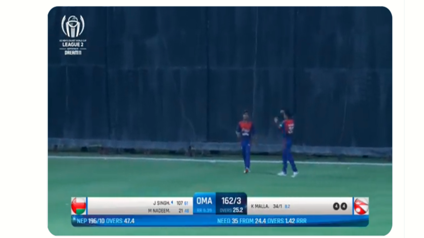 २६ औँ ओभरमा नेपालका कुशल मल्लको तेस्रो बलमा ओमानका जतिन्दर सिंहले लंग अनतर्फ एक शट खेलेका थिए । जतिन्दरको शट हेर्दा त्यो बलले सजिलै बाउन्ड्री लाइन पार गर्ने लागेको थियो, तर रोहितले त्यो बल क्याच आउट गरे ।