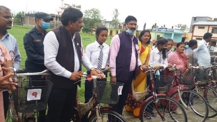 रौतहट । प्रदेश नं २ सरकारको ‘मुख्यमन्त्री बेटी बचाऊ, बेटी पढाऊ’ कार्यक्रमअन्तर्गत आज रौतहटको गौर स्थित श्री जुद्ध नमूना माध्यमिक विद्यालयका कक्षा ९ मा अध्यायनरत छात्रालाई साइकल वितरण गरिएकाे छ ।No description available.