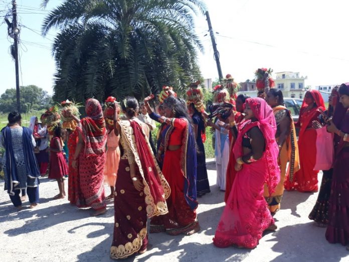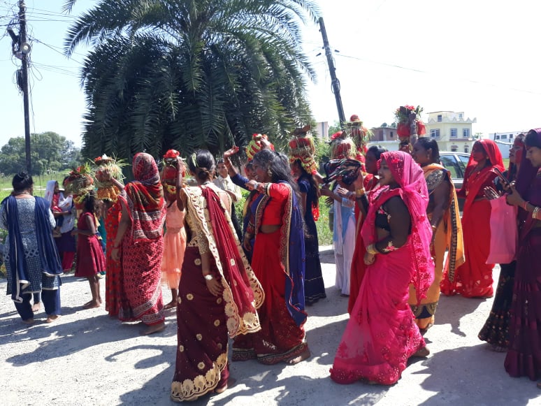 रङ्गीबिरङ्गी पोशाकमा सजिएका केही कन्याहरूले टाउकोमा कलश अड्याएका छन् । उनीहरू संगीतको तालमा कम्मर मर्काउँछन् तर भीडका बाँकी सदस्यको उन्मुक्त नाचगान रमाइलोले स्थानीयको ध्यान खिचेको छ ।