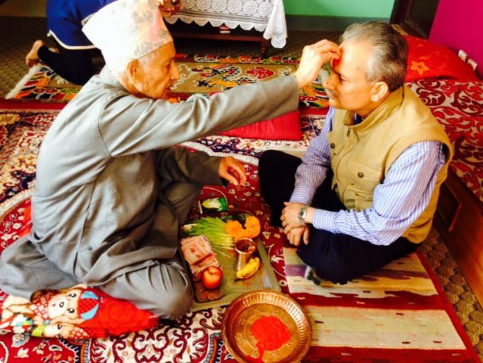 काठमाडौँ । जनता समाजवादी पार्टीका संघीय परिषद अध्यक्ष डा. बाबुराम भट्टराईले आफ्ना पिताको हातबाट दशैँको टीका लगाएका छन् । पूर्व प्रधानमन्त्री समेत रहेका नेता भट्टराईले परिवारका सदस्यहरुसँगै दशैँ मनाएका हुन् ।