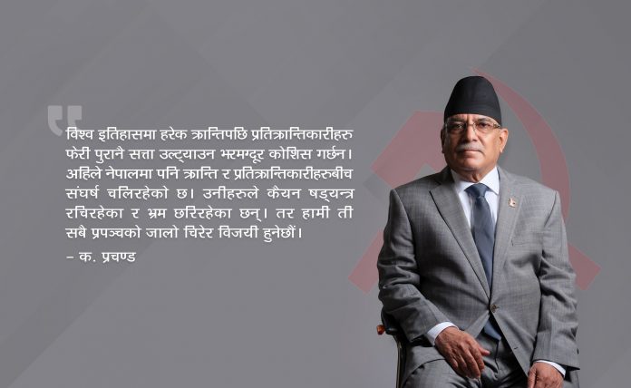 बुधवार नेकपा(माओवादी केन्द्र)को बागमती प्रदेश समितिको दोस्रो पूर्ण बैठकलाई सम्बोधन गरी फर्किने क्रममा न्युज एजेन्सी नेपालसँग संक्षिप्त कुराकानी गर्दै अध्यक्ष दाहालले गठबन्धन र सरकार टुटाउने षड्यन्त्र भइरहेको बताउनुभएको हो । राजनीतिक परिवर्तनहरुलाई कमजोर पार्ने खतरा बढिरहेको उहाँले बताउनुभयो । उहाँले परिवर्तनलाई कमजोर पार्ने खतरा भएपनि प्रतिक्रान्ति नै हुने भइसक्यो भन्नेचाहीँ सत्य नभएको स्पष्ट पार्नुभयो । उहाँले भन्नुभयो – ‘खतरा त बढेकै छ नि । यो परिवर्तन कुनै न कुनै रुपले कमजोर पार्ने, यो गठबन्धन टुटाउने, यो सरकार टुटाउने षड्यन्त्र त भइराखेकै छ नि । तर अहिले भर्खरै प्रतिक्रान्ति नै हुने भइसक्यो भन्ने कुरा चाहीँ होइन ।’