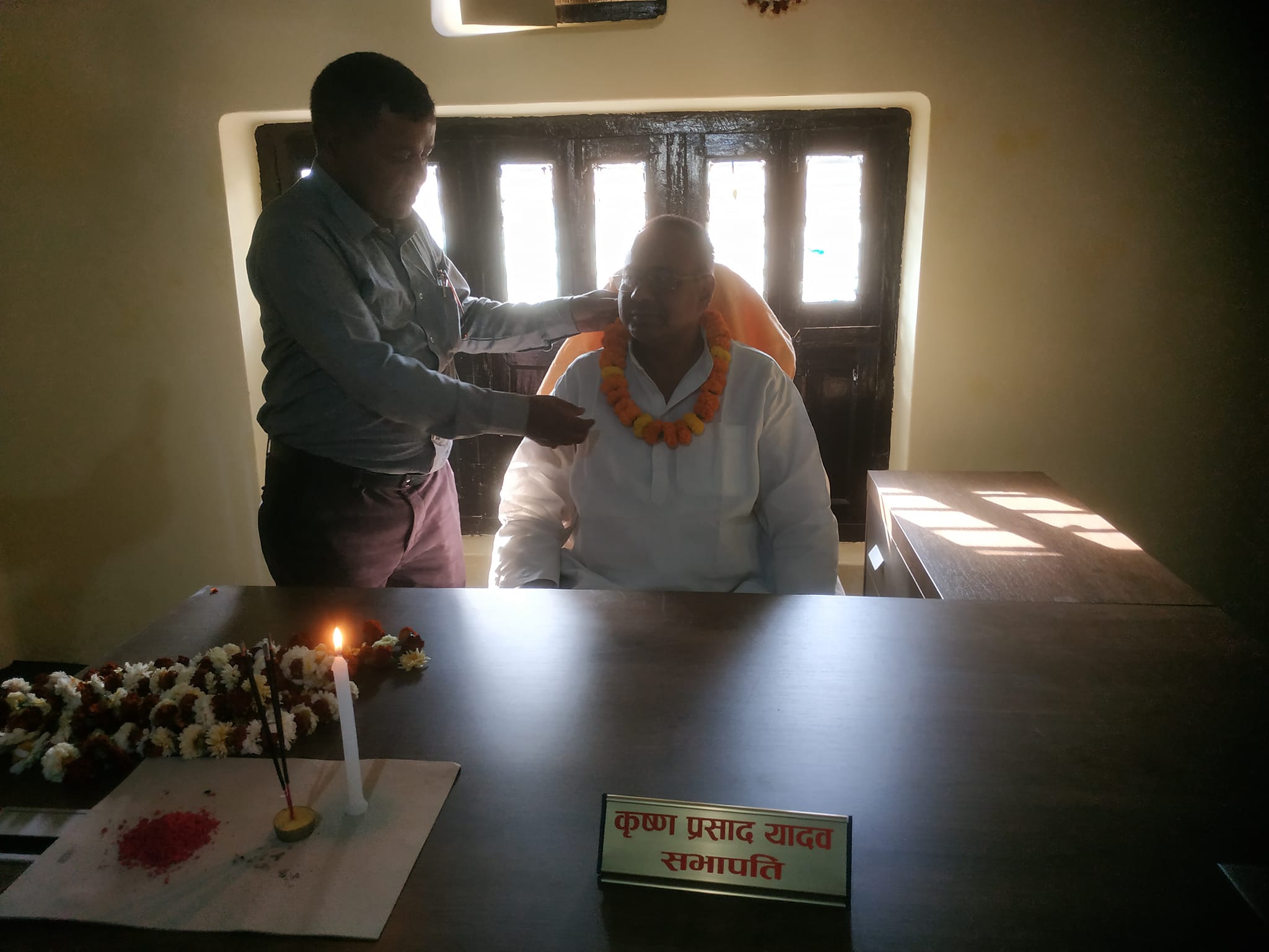 नेपाली काँग्रेस मधेश प्रदेश सभापति कृष्णा यादव सोमबारबाट पदभार ग्रहण गर्नु भएको छ । माघ महिनामा सम्पन्न भएको प्रदेश अधिवेशनबाट प्रदेश सभाका आफना निकटतम प्रतिब्दन्दी रामसरोज राय यादवलाई पराजित गर्दै सभापतिमा निर्वाचित भए पछि जिल्लाको अधिवेशनहरु सम्पनन नभएका कारण पदभार सम्भालन नसकेका यादव सोमबार प्रदेश कार्यालय जनकपुर गई पदभार ग्रहण गरेका छन् । उनका साथै उनी संगै निवार्चित भएका पदाधिकारीहरु समेतले सोमबारबाट पदभार ग्रहण गरेको उनका सहयोगी सन्तु यादवले जानकारी दिनु भएको हो । नेपाली कांग्रेस मधेश प्रदेशका सभापति कृष्ण यादवले स्वर्गिय बिपी कोइरालाको तस्बिरमा अबिर तथा माला लगाइ औपचारिक रूपमा आजबाट नेपाली कांग्रेस मधेश प्रदेश कार्यसमितिको कार्यालय जनकपुरमा पदभार ग्रहण गरेका छन् । सभापति यादव यस अघि रौतहट जिल्लाको नेपाली काँग्रेसको जिल्ला सभापतिमा २ पटक निर्वाचित भएका थिए ।