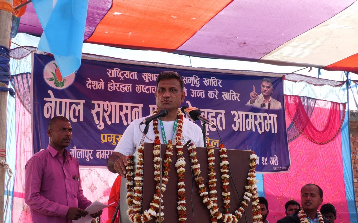 रौतहटको मौलापुर नगरपालिकाको सोरनियामा नेपाल सुशासन पार्टीको पार्टी प्रवेश तथा कार्यकर्ता भेटघाट कार्यक्रम सम्पन्न भएको छ । केन्द्रिय अध्यक्ष रमेश खरेलको प्रमुख आतिथ्यतामा सम्प न भएको कार्यक्रममा विभिन्न पार्टीका नेता तथा कार्यकर्ताहरुले पार्टी प्रवेश गरेका छन् । पार्टी प्रवेश गराउन आएको पार्टीका केन्द्रिय अध्यक्ष रमेश खरेलले विभिन्न पार्टीका नेताहरुले जनतालाई झुक्याउने काम कायमै रहेकोले उक्त कार्यबाट बच्न सबैमा आग्रह गर्नु भएको छ । अध्यक्ष खरेलले प्रत्येक नेपालीको ठाउका मा रिण थप्ने कार्य मात्र बर्तमान राजनितीकदलहरु तथा सरकारले गरेको भन्दै देश र जनतालाई रिण मुक्त गराउन नेपाल सुशासन पार्टीमा आउन आग्रह समेत गरेका छन् । अध्यक्ष खरेलले देशका बर्तमान नेताहरु भष्मासुर रहेको टिप्पणी गर्दै सबै भन्दा बढी भ्रष्टाचार सिंहदरबारबाट भएको आरोप समेत लगाए । कार्यक्रम पार्टीका नेता राजकुमार यादव, रामचन्द्र यादव लगायतका वक्ताहरुले सम्बोधन गरेका थिए भन्ने जिल्ला अध्यक्ष रंजित पटेलको अध्यक्षतामा भएको कार्यक्रममा केन्द्रिय सदस्य स्थानिय नेता तथा कार्यकर्ताहरुको बाक्लो उपस्थिति रहेको थियो ।