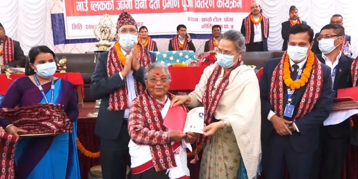 सरकारले कीर्तिपुर ५ वडा पांगाको खाःचो बस्तिमा स्वबासीलाई जग्गा धनी प्रमाण पत्र लालपूर्जा वितरण गरेको छ ।२०१९ सालको जग्गा नापजाँच ऐनपछि ब्लक नापी भई हालसम्म ब्लकमै रहेका जग्गाको सरकारले पुनः कित्ता नाप गरि मंगलबार लालपुर्जा वितरण गरिएको हो । नापी भएर अहिलेसम्म ब्लकमा रहेका ३६ वटा कित्ताका ३२ स्थानीय घर परिवारलाई भूमि ब्यवस्था, सहकारी तथा गरिवी निवारण मन्त्री शशी श्रेष्ठले लालपुर्जा वितरण गर्नुभएको हो । लालपूर्जा वितरण कार्यक्रममा बोल्दै मन्त्री श्रेष्ठले भमिहिन नागरिकलाई जमिन उपलब्ध गराउने पहिलो प्राथमिता रहेको बताउनु भयो । उहाँले भमिहिन नागरिकलाई जग्गा दिने चार महिनाको अभियानमा १५ हजार भुमिहिन नागरिकलाई लालपूर्जा वितरण गरि सकिएको बताउनु भयो । मन्त्री श्रेष्ठले राष्ट्रिय भुमि आयोग मार्फत अहिले रहेको भुमिहिन समस्या सदाका लागि अन्त्य गर्ने गरी काम गरिरहेको बताउनु भयो । उहाँले किर्तिपुरका स्वबासीका जनतालाई यो वर्षको कार्यक्रम नै नभएको बजेट तथा कर्मचारी अभावका बीच तत्काल जग्गा नापी गरेर भुमिहिन जनतालाई जग्गाको लालपूर्जा वितरण गरिएको बताउनु भयो ।मन्त्री श्रेष्ठले जग्गा पूर्जा वितरण गर्न खोज्यो भने गर्न सकिने रहेछ भन्ने एउटा उदाहरण भएको पनि बताउनु भयो । उहाँले सरकारले सहिद,बेपता परिवार,हलिया,कमैया,कम्लरी,हरुवा, चरुवा लगायत सिमान्तकृत समुदायका लागि नापी तालिमको व्यवस्था गर्ने बताउनु भयो । उहाँले भन्नुभयो,‘