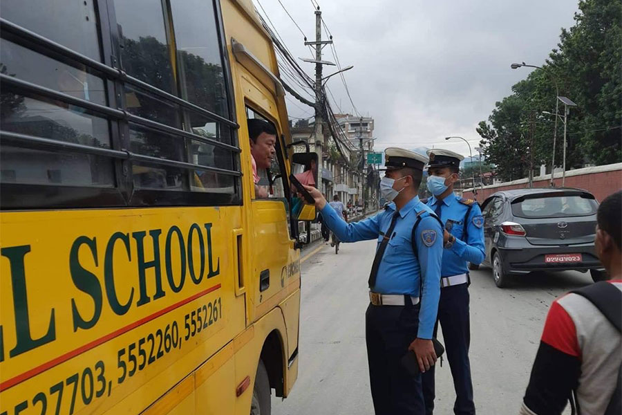 ट्राफिक नियम पालना नगर्ने १६ वटा स्कुल बसका चालक कारबाहीमा परेका छन् । स्कुल बस निर्देशिका २०७४ विपरीत ट्राफिक नियम उल्लंघन गर्ने सवारी साधनलाई ८ साउनदेखि कारबाही तथा सचेतना अभियान थालिएको हो । अभियानलाई निरन्तरता दिने क्रममा काठमाडौं उपत्यका ट्राफिक प्रहरी कार्यालयले आइतबारमात्रै विभिन्न स्कुलका १६ वटा बसलाई कारबाही गरेको हो । १६ मध्ये पाँचवटा बसका चालक मादक पदार्थ सेवन (मापसे) गरेर कारबाहीमा परेको काठमाडौं उपत्यका ट्राफिक प्रहरी कार्यालयले जनाएको छ । चेकजाँचका क्रममा मापसे गरेको पाइएपछि उनीहरूलाई नियन्त्रणमा नियन्त्रणमा लिएर कारबाही गरिएको प्रवक्ता प्रहरी वरिष्ठ उपरीक्षक (एसएसपी) राजेन्द्रप्रसाद भट्टले जानकारी दिए । स्कुल बस चेकजाँच अभियानलाई निरन्तर संञ्चालन गरिने प्रवक्ता भट्टले बताए ।