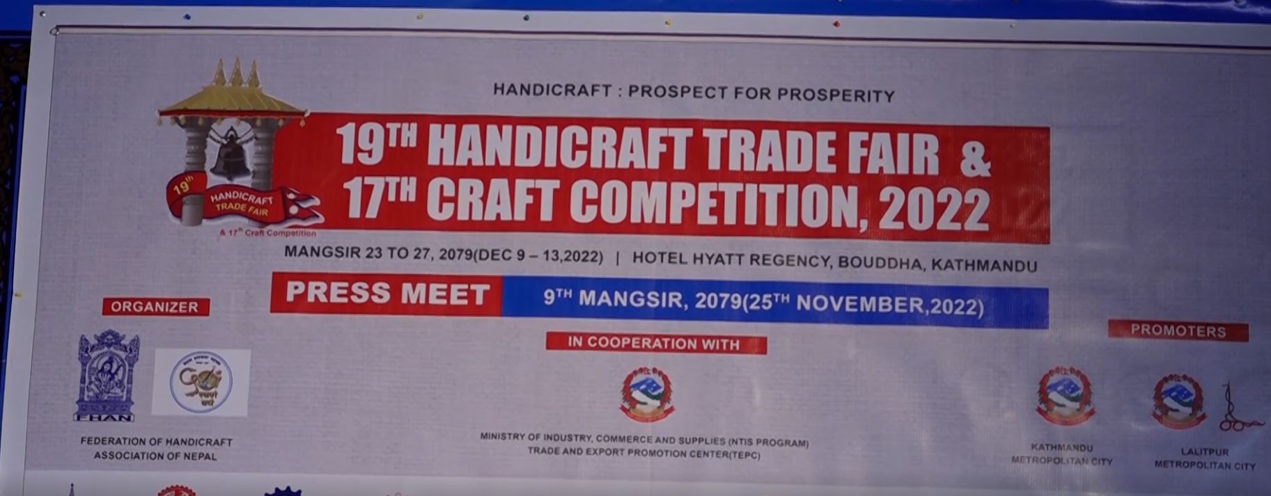 २०७९ मंसिर ९ गते । काठमाडौंमा १९ औँ हस्तकला व्यापार मेला हुने भएको छ । नेपाल हस्तकला महासंघले हरेक वर्ष गर्दै आएको हस्तकला व्यापार मेलाको १९ औँसंस्करण आगामी मंसिर २३ गतेदेखि २७ गतेसम्म हुने भएको हो । मेला काठमाडौंकोबौद्धस्थित होटेल हायात रिजेन्सीमा हुने भएको छ । महासंघको आयोजना तथाउद्योग, वाणिज्य तथा आपूर्ति मन्त्रालय, व्यापार तथा निकासी प्रवद्र्धनकेन्द्र र उद्योग वाणिज्य क्षेत्रका विभिन्न संघ, संगठनहरुको सहयोगमा हुनलागेको मेलामा हस्तकलाकावस्तुहरुको करिव १५० वटा स्टल रहने बताइएको हो ।मेलामा फिलगिरी, थोज्यामाज्या (धातु पत्रकला) र पौभा थांका गरी ३ वटाविधाका कला प्रदर्शनी हुने जनाइएको छ । महासंघका अध्यक्ष प्रचण्ड शाक्यलेनेपाली हस्तकलाको प्रवद्र्धन गर्दै विदेशसम्म पहिचान गराउनका लागि मेलाकोआयोजना गरिएको बताउनु भयो । उहाँले मेलाले हस्तकलाका सामग्रीहरुकोनिर्यातलाई बढाउनका लागि सघाउ पु¥याउने बताउनु भयो ।