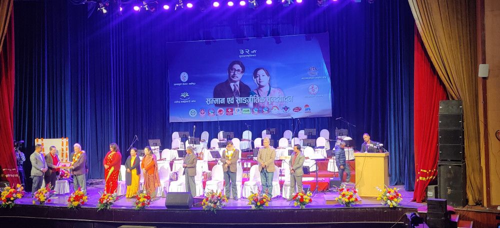 स्वरसम्राट नारायण गोपालको ३२ औं पुण्यस्मृतिमा वरिष्ठ गीतकार राजेन्द्र थापा र संगीतकार प्रकाश गुरुङलाई सम्मान गरिएको छ ।  स्वरसम्राट नारायण गोपालको ३२ औं पुण्यस्मृतिका अवसरमा काठमाडौंमा आयोजित एक कार्यक्रमबीच अग्रज श्रष्टाद्वय थापा र गुरुङलाई नारायणगोपाल स्मृति सम्मान एवं पुरस्कार प्रदान गरिएको हो । सम्मान कार्यक्रममा बोल्दै वरिष्ठ गीतकार राजेन्द्र थापाले नारायणगोपालको स्वरमा भएको मिठासका बारेमा अध्ययन हुन जरुरी रहेको बताउनु भयो । उहाँले नारायणगोपालको शालिक, प्रतिष्ठान एउटा नाममा मात्रै सिमित नभइ समग्र गीत÷संगीत नै समाविष्ट रहेको प्रतिमूर्तिका  रुपमा चित्रण गर्नुभयो । उहाँले नारायणगोपालले ३० को दशकमा आफूलाई राजेन्द्र थापाको फ्यान हुँ भनेर दिएको सम्मान नै आफ्ना लागि सबैभन्दा ठूलो सम्मान भएको बताउनु भयो । कार्यक्रममा वरिष्ठ संगीतकार प्रकाश गुरुङले नारायणगोपालले गीत गाउँदा घर नै गुञ्जायमान हुने र शरीरबाट पनि मधुरो आवाज निस्किने भन्दै प्रशंसा गर्नुभयो । उहाँले आफूले देखेका अहिलेसम्मका गायक गायिकाहरुमा त्यो किसिमको कला नपाएको बताउनु भयो । स्वरसम्राट नारायणगोपालको ३२ औं पुण्यस्मृति सभा देशभर विभिन्न कार्यक्रम गरेर मनाइएको छ ।