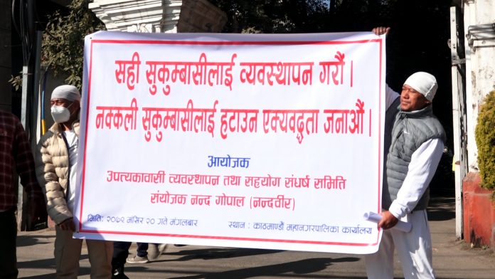 सुकुम्वासीको नाममा भइरहेको दादागिरीको अन्त्य हुनुपर्ने बताएको हो । समितिले सुकुम्वासीको खोल आढेर र राजनीतिक दलहरुको छत्रछायाँमा हतियार बोकेर हिँड्न नमिल्ने भन्दै महानगरले गरेको काम सही भएको जनाएको छ । काठमाडौं महानगरसँग ऐक्यवद्धता जाहेर गरेपछि मंगलवार महानगरपालिकाको कार्यालय अगाडि प्रदर्शन गर्दै समितिले सही सुकुम्वासी पहिचान हुन नसक्दा उपत्यकाको नदी किनार लथालिङ्ग भएको बताएको छ । प्रदर्शनपछि बोल्दै आन्दोलित
