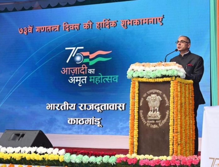 काठमाडौंस्थित भारतीय राजदुतावासले आफ्नो ७४ औं गणतन्त्र दिवस मनाएको छ । बिहीवार राजदुतावासले विभिन्न कार्यक्रमको आयोजना गरी काठमाडौंमा आफ्नो ७४ औं गणतन्त्र दिवस मनाएको हो । सो अवसरमा भारत र नेपालबीचको जनस्तरको सम्बन्धलाई थप सुदृढ बनाउन पु¥याएको योगदानलाई कदर गर्दै कही व्यक्तिहरुलाई सम्मानसमेत गरिएको छ । साथै भारतीय सेनामा कार्यरत रहेर दिवंगत हुनुभएका नेपालीहरुको सम्मानमा उहाँहरुको परिवारलाई पनि कम्बलसहित चेक हस्तान्तरण गरिएको थियो । त्यसअघि दुतावास परिसरमा नेपालका लागि भारतीय राजदुत नविन श्रीवास्तवले भारतको राष्ट्रिय झण्डा फहराउनुका साथै राष्ट्रपतिको सन्देश पढेर सनाउनुभएको थियो । दुतावासले नेपालका विभिन्न पुस्तकालय र शैक्षिक संस्थाहरुलाई उपहारस्वरुप पुस्तक प्रदानसमेत गरेको छ । भारतले हरेक वर्ष २६ जनवरीमा आफ्नो गणतन्त्र दिवस मनाउने गर्छ ।