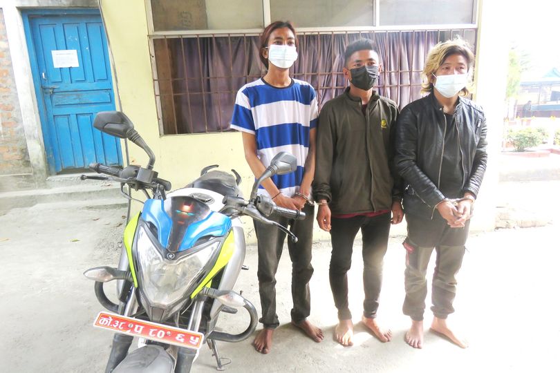 अस्थायी प्रहरी चौकी नहडाबाट खटिएको प्रहरी टोलीले चेकजाँचको क्रममा गत माघ ६ गते धरान(११ का सुरज तामाङको घरमा पार्किङ गरी राखेको अवस्थामा चोरी भएको प्रदेश १ ( ०२ (०४०प २८१८ नम्बरको मोटरसाईकलको नम्वर प्लेटलाई को। ३८ प ८०६५ लेखि चलाई रहेको अवस्थामा उनिहरुलाई पक्राउ गरेको हो । पक्राउ परेका तीनै जनालाइ हिरासतमा लिए थापा अनुसंधन भैरहेको इलाका प्रहरी कार्यालय धरानले जनाएको छ ।