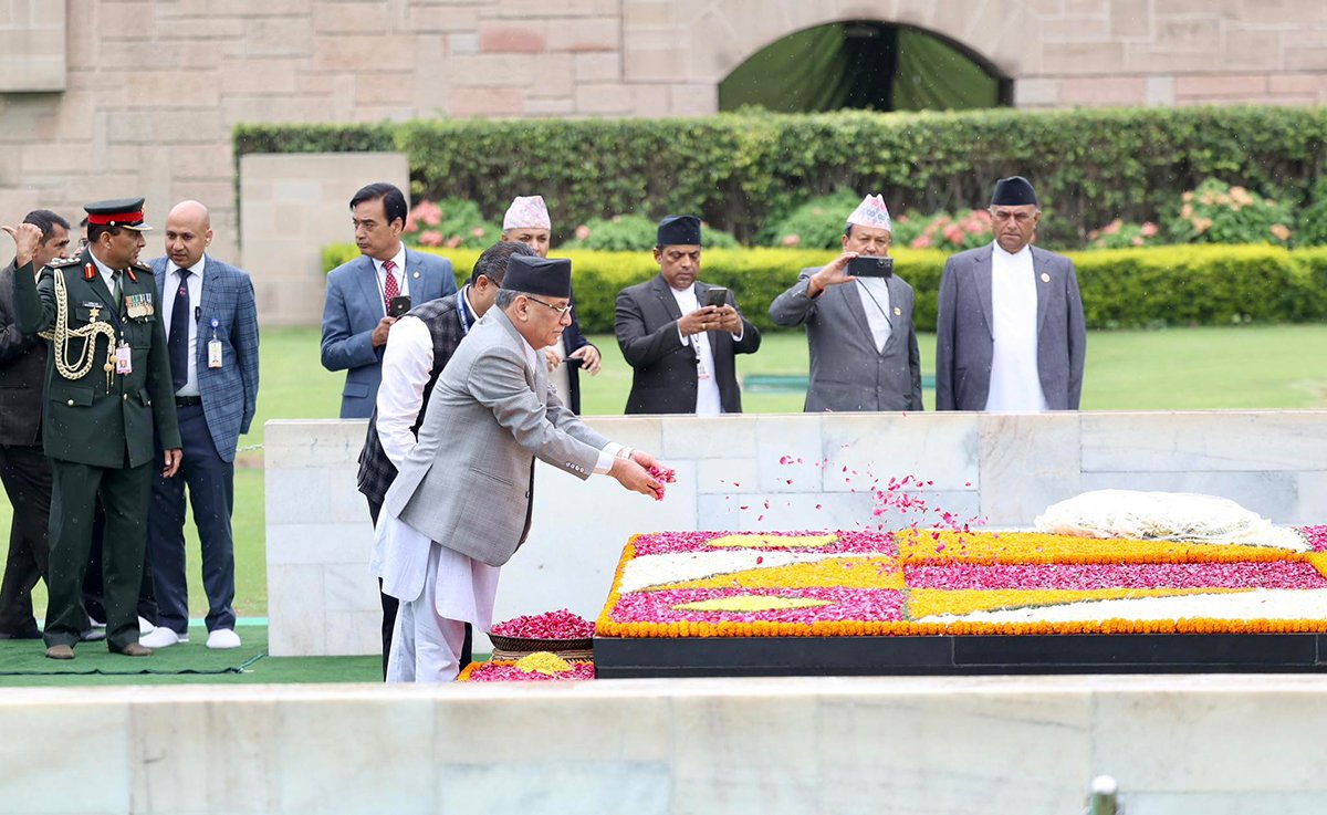 प्रधानमन्त्री पुष्पकमल दाहाल ‘प्रचण्ड’ नयाँदिल्लीस्थित राजघाट पुगेर महात्मा गान्धीको समाधिस्थलमा पुष्पहार अर्पण गर्नुभएको छ । भारतमा मात्र नभई विश्वमै शान्ति र अहिंसाका प्रवर्तकका रुपमा परिचित गान्धीप्रति विशेष सम्मान प्रकट गर्न प्रधानमन्त्री प्रचण्ड त्यहाँ पुग्नुभएको हो । महात्मा गान्धीलाई नेपालमा पनि उत्तिकै सम्मान गरिने भएकाले भारत भ्रमणमा पुग्ने नेपालका प्रधानमन्त्री गान्धीप्रति सम्मान प्रकट गर्न राजघाट पुग्ने गर्नुहुन्छ । भारत सरकारले राजघाटलाई पर्यटकीय क्षेत्रका रुपमा पनि विकास गरेको छ । राजघाटमा राखिएको पुस्तिकामा प्रधानमन्त्री दाहालले महात्मागान्धीलाई अहिंसाका प्रवर्तक एवं शान्ति र सत्याग्रहमार्फत स्वतन्त्र भारत निर्माण गरेका व्यक्तित्व भनी टिप्पणी गर्नुभएको छ । प्रधानमन्त्री प्रचण्ड नेपाली प्रतिनिधिमण्डलको नेतृत्व गर्दै बुधबार नयाँदिल्ली आइपुग्नुभएको हो । आजै उहाँले आफ्ना भारतीय समकक्षी नरेन्द्र मोदीसँग भेटवार्ता गर्ने कार्यक्रम रहेको छ ।