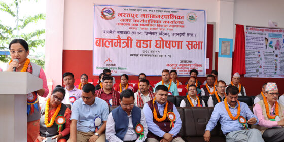 भरतपुरलाई बालमैत्री नगर बनाउन विसं २०६८ सालदेखि नै अभियान थालिएको हो । आर्थिक वर्ष ०८३÷०८४ मा महानगरपालिकालाई बालमैत्री महानगरपालिका घोषणा गर्ने लक्ष्य लिइएको छ । बालबालिकालाई मूल प्रभाहिकरण गर्नुपर्छ भन्ने उद्देश्यले राज्यले दिगो विकास लक्ष्यमा समेत राखेको छ । सो महानगर प्रमुख दाहालले सिङ्गो महानगरपालिकालाई बालमैत्री महानगरपालिका घोषणा गर्ने अभियान जारी रहेको बताउनुभयो । भरतपुरलाई बालमैत्री बनाउन सडक मानवमुक्त पहिलो महानगर, पिटुसिटु, अटिजम विद्यालय, आधा दर्जन विद्यालयमा स्रोत कक्षालगायतको कार्य गरी बालमैत्रीतर्फ उन्मुख हुँदै गएको छ । उपप्रमुख चित्रसेन अधिकारीले बालमैत्री वडा कायम राख्न सबै पक्षले विशेष चासो र चिन्ता लिनुपर्ने बताउनुभयो । घोषणा गर्ने तर व्यवहारमा फरक हुने परम्परा रहेको जनाउँदै उहाँले यसका लागि वडावासी सबै जिम्मेवार बन्नुपर्ने बताउनुभयो । बालमैत्री घोषणासँगै थप चुनौती रहेको भनाइ छ । प्रमुख जिल्ला अधिकारी सुरेन्द्र पौडेलले बालमैत्री घोषणा गरेर यसलाई कायम राख्न सधँै सबै पक्ष क्रियाशील हुनुुपर्ने बताउनुभयो । कार्यक्रममा भरतपुर महानगरपालिकाका प्रमुख प्रशासकीय अधिकृत नरेन्द्रकुमार राना, विभिन्न वडाध्यक्ष, जिल्ला प्रहरी कार्यालय चितवनका प्रमुख रामेश्वर कार्कीलगायतको उपस्थिति रहेको थियो ।