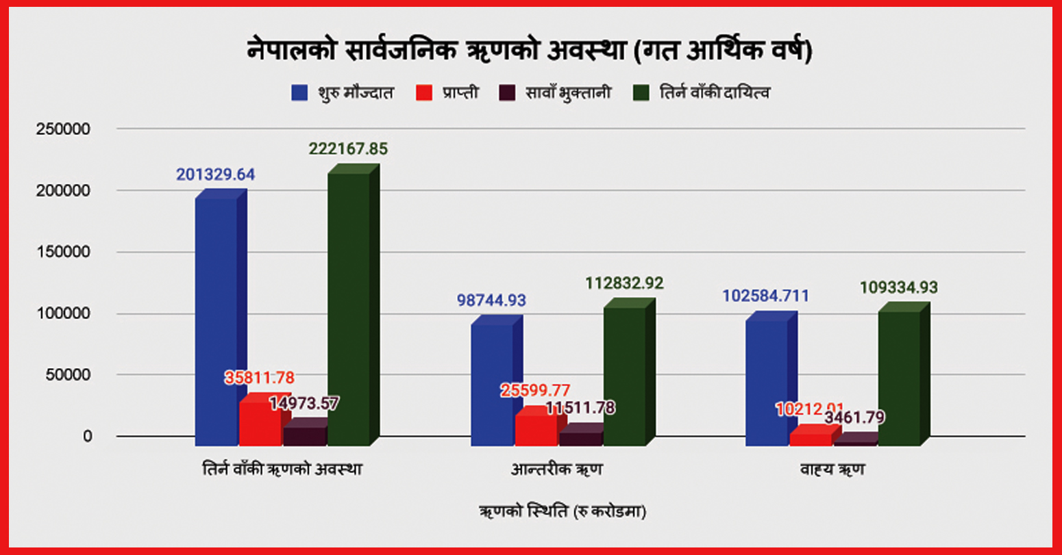 नेपालले तिर्न बाँकी सार्वजनिक ऋण रू २२ खर्ब २१ अर्ब ६७ करोड ८५ लाखभन्दा बढी पुगेको छ । सार्वजनिक ऋण व्यवस्थापन कार्यालयले सार्वजनिक गरेको तथ्याङ्कअनुसार गत आर्थिक वर्ष २०७९/८० को अन्तसम्ममा नेपालले रू ११ खर्ब २८ अर्ब ३२ करोड ९२ लाख बराबर आन्तरिक र रू १० खर्ब ९३ अर्ब ३४ करोड ९३ लाख बराबर बाह्य ऋण तिर्न बाँकी रहेको देखिएको हो । गत आर्थिक वर्षमा मात्र नेपालको सार्वजनिक ऋण रू दुई खर्ब आठ अर्ब ३८ करोड २१ लाख थपिएको छ । अघिल्लो आर्थिक वर्ष २०७८/७९ को असार मसान्तसम्ममा यस्तो ऋण रू २० खर्ब १३ अर्ब २९ करोड ६४ लाख बराबर थियो । गत आर्थिक वर्षमा मात्र रू एक खर्ब ४० अर्ब ८७ करोड ९९ लाख बराबर आन्तरिक र रू ६७ अर्ब ५० करोड २२ लाख बराबर बाह्य ऋण थपिएको सार्वजनिक ऋण व्यवस्थापन कार्यालयले जनाएको छ ।