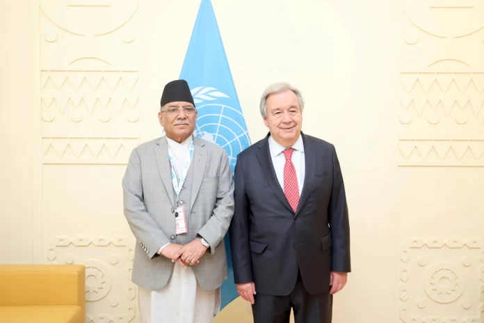 प्रधानमन्त्री पुष्पकमल दाहाल ‘प्रचण्ड’ र संयुक्त राष्ट्रसङ्घका महासचिव एन्टोनियो गुटेरसबीच भेटवार्ता भएको छ । संयुक्त राष्ट्रसङ्घीय खाद्य तथा कृषि सङ्गठनको मुख्यालय इटालीको रोममा जारी संयुक्त राष्ट्रसङ्घीय खाद्य प्रणाली २०२३ सम्मेलनका क्रममा उहाँहरूबीच भेटवार्ता भएको हो ।सो सम्मेलनमा सम्बोधनपछि प्रधानमन्त्री दाहालसँग राष्ट्रसङ्घीय खाद्य तथा कृषि सङ्गठनको मुख्यालयमा स्थानीय समयअनुसार आज दिउँसो साढे १ बजे महासचिव गुटेरसको भेटवार्ता भएको प्रधानमन्त्रीको सचिवालयले जनाएको छ ।सो अवसरमा पर्यावरण, खाद्य सुरक्षा र नेपाल र संयुक्त राष्ट्रसङ्घबीचको सम्बन्धलाई अझ मजबुत बनाउनेबारे छलफल भएको बताइएको छ । प्रधानमन्त्री दाहाल यही शनिबार त्यसतर्फ प्रस्थान गर्नुभएको हो । उहाँको साथमा कृषि तथा पशुपक्षी विकासमन्त्री डा बेदुराम भुसाललगायत हुनुहुन्छ ।