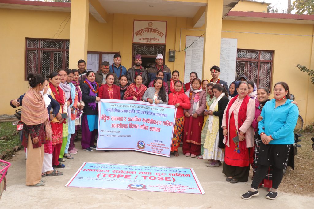 मण्डनदेउपुर नगरपालिकाले विभिन्न सीपमूलक तालिममार्फत लद्युउद्यमका लागि ८० नयाँ उद्यमी जनशक्ति तयार पारेको छ ।नगरपालिकाको आर्थिक तथा प्राविधिक सहयोगमा सञ्चालित गरिबी निवारणका लागि लघुउद्यम विकास कार्यक्रमअन्तर्गत एक वर्षको अवधिमा ८० महिला तथा पुरुषलाई उद्यमी बनाइएको हो । कार्यक्रमअन्तर्गत नगरपालिकाले विभिन्न समयमा सिलाइकटाइ, गलैँचा बुनाइ, ब्यूटीसियन र मोटरसाइकल वर्कशपको एक÷एकमहिना तालिम प्रदान गरेको थियो । त्यसैगरी बाख्रापालन र तरकारी खेतीसम्बन्धी पाँच÷पाँच दिनको तालिम सञ्चालन गरिएको थियो ।चालिस महिलाका लागि ‘एड्भान्स’ सिलाइकटाइ तालिमसमेत प्रदान गरिएको नगरपालिकाका रोजगार संयोजक एवं लघुउद्यम विकास कार्यक्रमका स्रोत व्यक्ति सुरज पौडेलले जानकारी दिनुभयो । गत आर्थिक वर्ष २०७९÷८० मा उक्त कार्यक्रम नगरपालिकाका वडा नं ४, ५, ८ र १० मा सञ्चालन गरिएको थियो ।नगरपालिकाका चार वडामा नयाँ सिर्जित उद्यमीलाई नगरप्रमुख टोकबहादुर वाइबा र उपप्रमुख विष्णुमणि नेपालले वडास्तरमै प्रमाणपत्र र प्रविधि हस्तान्तरण गर्नुभएको छ । “सीपमूलक तालिमप्राप्त स्थानीयले व्यवहारमा उतार्न प्रतिबद्धता जनाउनुभएको छ, नगरपालिकामा नयाँ उद्यमी थपिएकोमा खुसी छौँ”, वाइबाले भन्नुभयो ।उहाँले एक महिनाको सिलाइकटाइ तालिम पूरा गरेकालाई थप दुई महिनाको ‘एड्भान्स’ तालिम दिने तयारी भएको बताउनुभयो । सिलाइकटाइ, गलैँचा बुनाइ र ब्यूटिसियन तालिममा महिला मात्र सहभागी थिए । नगरपालिकाले एड्भान्स तालिमको व्यवस्थापन गर्नेछ भने मेसिन खरिदमा साझेदारी गर्ने जनाएको छ । यस्तै नगरले अब लघुउद्यम कार्यक्रमर्फत समाजमा पछिपरेका वर्ग र समुदायलाई पहिलो प्राथमिकताका दिइने जनाएको छ ।यसैगरी नगरपालिकाले सिलाइकटाइ तालिममा सहभागी दुई जनाका लागि एक थानका दरले १८ मेसिन प्रदान गरेको छ । यस्तै चार थान गलैँचा बुन्ने मेसिन र एक सय लिटर क्षमताका १८ पानी ट्याङ्कीसमेत वितरण गरिएको छ ।