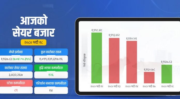 १३ भदौयता लगातार घट्दै आएको सेयर बजार परिसूचक नेप्सेमा एकल अंकको वृद्धि भएको छ ।सोमबार सेयर बजार ७.०४ अंक (० दशमलव ३५ प्रतिशत)ले बढेको छ । सोमबार नेप्से परिसूचक १९६७.८३ बिन्दुमा उक्लेर बन्द भएको हो ।१२ भदौमा १९९८.४८ विन्दुमा पुगेको सेयर बजार त्यसयता लगातार घट्दै आएको थियो । साताको पहिलो कारोबार दिन आइतबार सेयर बजार १९६०.७८ बिन्दुमा झरेको थियो ।सोमबार २७० धितोपत्रको ३२ हजार ५३३ वटा कारोबारबाट ३४ लाख ३२ हजार २६७ कित्ता सेयर किनबेच भएको छ । त्यसबाट एक अर्ब ९ करोड ३९ हजार ६९७ रुपैयाँ बराबरको कारोबार भएको छ । सोमबार थ्री स्टार हाइड्रोपावरको कारोबार सकारात्मक सर्किट लेबलमा भएको छ । यसको मूल्य १० प्रतिशतले वृद्धि भएर २७९.५० पुगेको छ । यस्तै दोल्ती पावर कम्पनी, ग्रीन भेन्चर लिमिटेड, रुरु जलविद्युत परियोजना, आशा लघुवित्त वित्तीय संस्थासहितको धितोपत्रका मूल्य समेत बढेको छ ।लिबर्टी इनर्जी कम्पनी, कुमारी धनवृद्धि योजना, सिक्लेस हाइड्रोपावर,आरबीबी म्युचुअल फन्ड २, ग्लोबल आईएमई फन्ड १ लगायतका धितोपत्रको मूल्य भने धेरैले घटेको छ ।