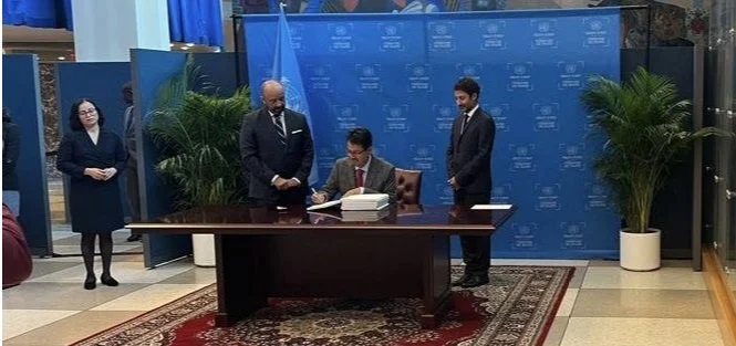 नेपालले वायो डाइभर्सिटी विओण्ड नेशनल जुरिडिक्सन (विविएनजे) सम्बन्धी सम्झौतामा हस्ताक्षर गरेको छ । संयुक्त राष्ट्रसङ्घको ७८औँ महासभामा भाग लिन आउनुभएका परराष्ट्रमन्त्री एनपी साउदले राष्ट्रसङ्घले प्रस्ताव गरेको उक्त सम्झौतामा हस्ताक्षर गर्नुभएको हो ।राष्ट्रसङ्घको मुख्यालय न्यूयोर्कमा बुधबार आयोजित समारोहमा नेपालको तर्फबाट मन्त्री साउदले हस्ताक्षर गर्नुभएको हो । अतिकम विकसित देशबाट यो सम्झौतामा हस्ताक्षर गर्ने नेपाल एक हस्ताक्षरकर्ता देश बनेको छ । खासगरी यो सम्झौताले पृथ्वीमा समुद्र र जमिनको भूभाग ३०÷३० प्रतिशत कायम गर्ने अवधारणालाई प्रभावकारीरुपमा कार्यान्वयन गर्नेछ । सन् २०३० सम्ममा यो सम्झौता लागू गरिसक्ने राष्ट्रसङ्घले जनाएको छ ।यो सम्झौतामा विश्वभरिका राष्ट्रलाई सन् २०२३ को सेप्टेम्बर २० देखि सन् २०२५ को सेप्टेम्बर २० सम्म हस्ताक्षर गर्ने समय सीमा दिइएको छ । नेपालले उक्त सम्झौता हस्ताक्षर गर्ने दिनमा नै हस्ताक्षर गरेको छ ।