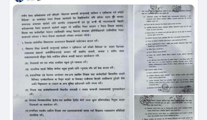 नेपाल सरकार र आन्दोलनरत नेपाल शिक्षक महासङ्घबीचको आजको निर्णायक वार्ता सहमति भएको छ । आज बिहानदेखि भएका अनौपचारिक वार्ता र गृहकार्यलाई मूर्तरुप दिँदै सात बुँदामा सहमति भएको हो ।उपप्रधानमन्त्री एवं गृहमन्त्री नारायणकाजी श्रेष्ठको उपस्थितिमा भएको वार्तामा सङ्घीय संसद्मा दर्ता भएको विद्यालय शिक्षासम्बन्धी विधेयकमा भएका व्यवस्थाहरुमा संविधानसँग नबाझिने गरी महासङ्घका मागलाई अधिकतम् सम्बोधन गराउन सरकारले सहजीकण गर्ने गरी सहमति भएको सञ्चार तथा सूचना प्रविधिमन्त्री एवं नेपाल सरकारका प्रवक्ता रेखा शर्माले सञ्चारकर्मीलाई जानकारी दिनुभयो । मन्त्री शर्माले सहमतिसँगै विभिन्न जिल्लाबाट आन्दोलनका लागि काठमाडौँ आएका समुदायिक विद्यालयका शिक्षक र कर्मचारीहरु घर फर्कने स्पष्ट गर्दै संविधानमो भएको व्यवस्थाबमोजिम स्थानीत तहको सञ्चालनअन्तर्गत विद्यालय रहने विषयमा कानुनले केही गर्न नसक्ने बताउनुभयो ।सार्वभौम संसद्मा दर्ता भइसकेको विधेयक फिर्ता नहुने जनाउँदै उहाँले कार्यान्वयनका क्रममा कसरी व्यवस्थित र सहजीकरण गर्न सकिन्छ भन्ने सवालमा सरकार सकारात्मक रहने पनि बताउनुभयो । आज बिहान कार्यवाहक प्रधानमन्त्री तथा रक्षामन्त्री पूर्णबहादुर खड्काले वार्तालाई आजै टुङ्गोमा पुर्याउने गरी लाग्न सरकारी वार्ता टोलीलाई सुझाव तथा निर्देशन दिनुभएको थियो । सङ्घीय संसद्मा गत भदौ २७ गते दर्ता भएको विद्यालय शिक्षासम्बन्धी विधेयकमा भएका पेसागत सवालमा असन्तुष्टि जनाउँदै महासङ्घले यही असोज ३ गतेदेखि काठमाडौँ सडक केन्द्रित आन्दोलन जारी राखेको छ ।महासङ्घले अस्थायी प्रकृतिका शिक्षकहरुको स्थायित्व, विद्यालय कर्मचारीको दरबन्दी सृर्जना, विद्यालय संरचनाबाहिर रहेका बाल कक्षा शिक्षक, अस्थायी अवधि गणना तथा निवृत्तीभरण, शिक्षक बढुवा, प्रधानाध्यापक नियुक्ति, सरुवा र कार्यसम्पादन मूल्याङ्कनलगायतका विषयमा सम्बोधन माग गर्दै आएको छ ।