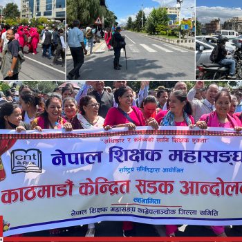 राहत शिक्षकहरुले सडक आन्दोलनलाई आइतबार पनि निरन्तरता दिएका छन् ।नेपाल राहत शिक्षक केन्द्रीय समितिको अगुवाइमा राहत शिक्षकहरुले आइतबार पनि काठमाडौंको माइतीघरदेखि नयाँ बानेश्वरसम्म सडकमा प्रदर्शन गरेका छन् ।उनीहरुले ४० हजार राहत शिक्षक, बालबिकासका शिक्षक र पेन्सन पीडित शिक्षकहरु आफूहरुसँग आन्दोलनमा रहेको बताएका छन् ।राहत शिक्षकहरुले शिक्षक महासंघले धोका दिएको भन्दै आफूहरुको माग पूरा नहुँदासम्म आन्दोलन जारी राख्ने बताएका छन् ।सरकार र शिक्षक महासंघबीच ६ बुँदे सहमति वार्तामा शिक्षक महासंघका प्रतिनिधिले राहत तथा अस्थायी प्रकृतिका शिक्षकको बचाउ गर्न नसकेको राहत शिक्षक केन्द्रीय समितिको आरोप छ ।